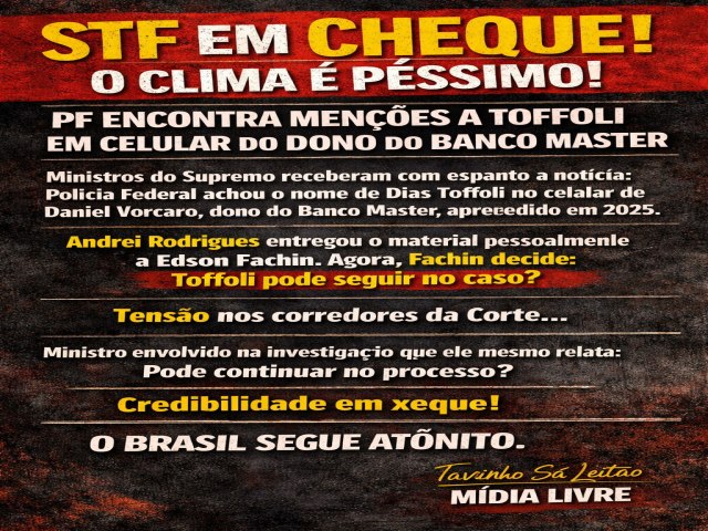 Ministros do Supremo Tribunal Federal receberam com espanto a informação de que a Polícia Federal encontrou menções ao nome do ministro Dias Toffoli no celular de Daniel Vorcaro, dono do banco Master, apreendido em 2025.